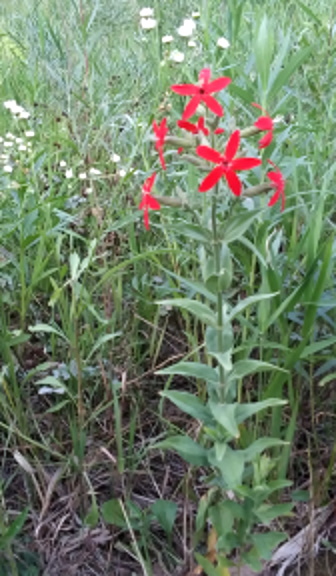 Royal Catchfly Silene regia makes its bright red flowers stand out among the white and purple wildflowers now blooming.